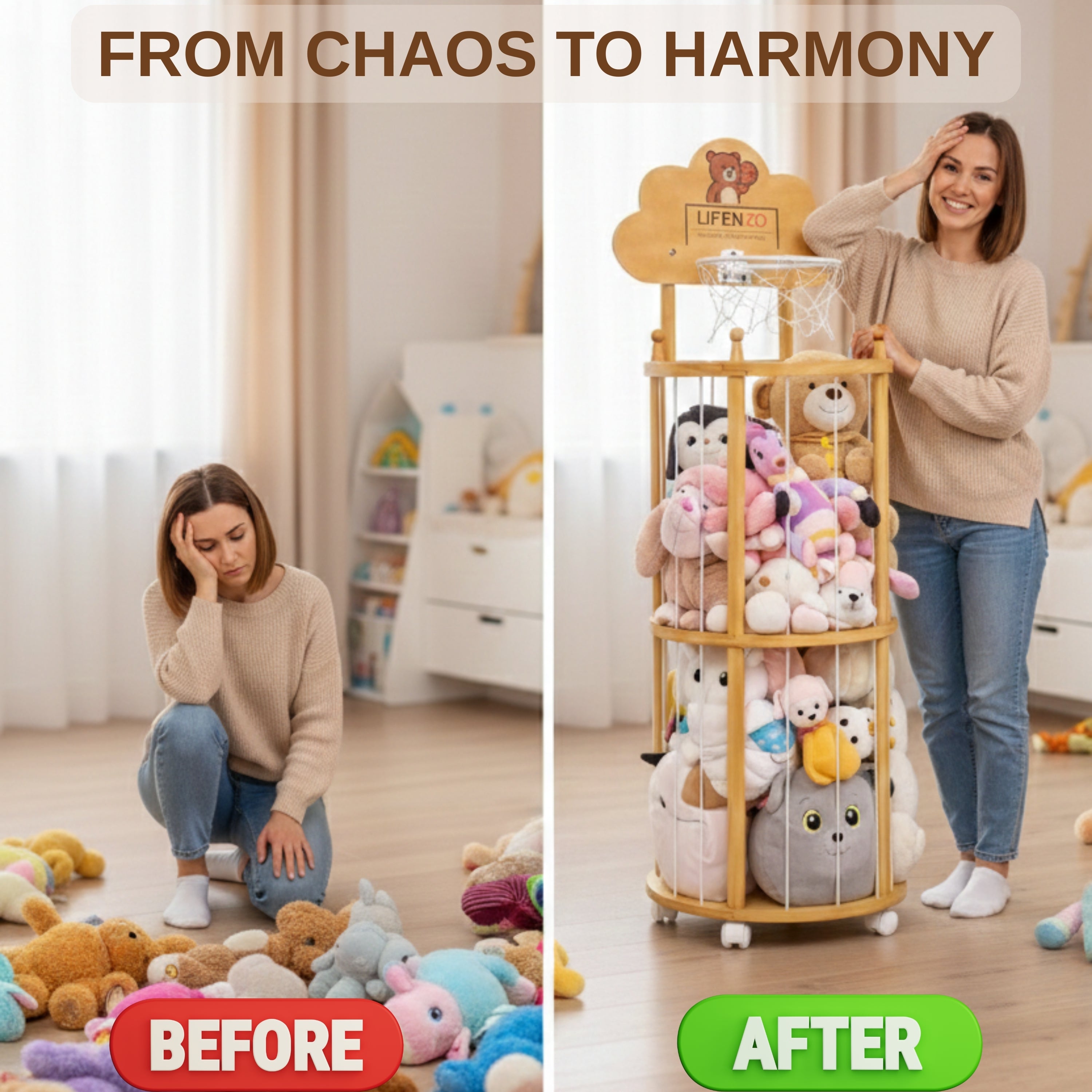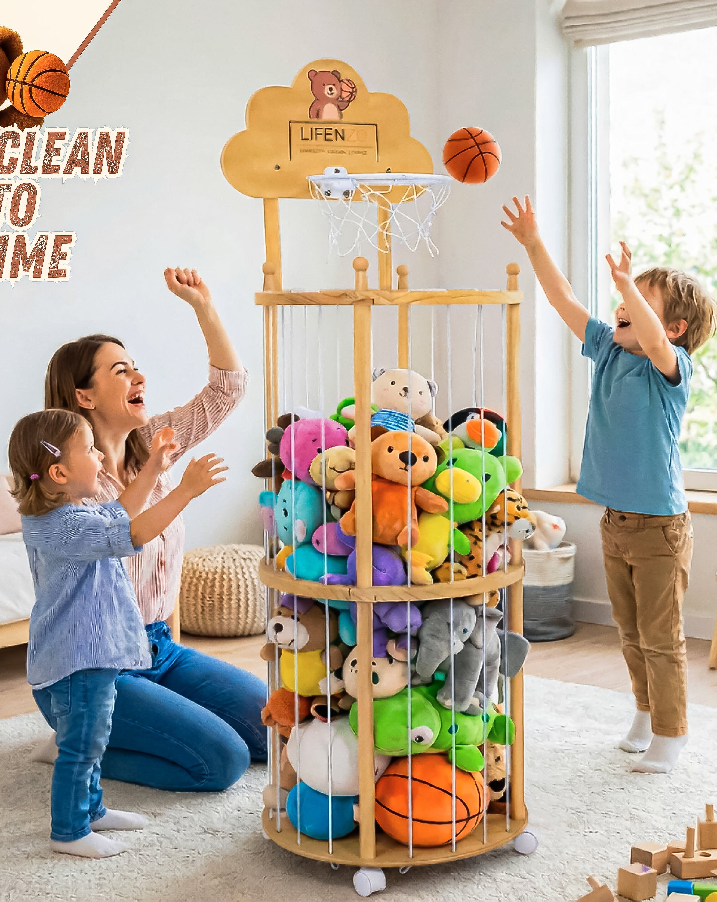 A wooden stuffed animal organizer with a built-in basketball hoop that helps keep kids’ rooms tidy, fun, and organized.
